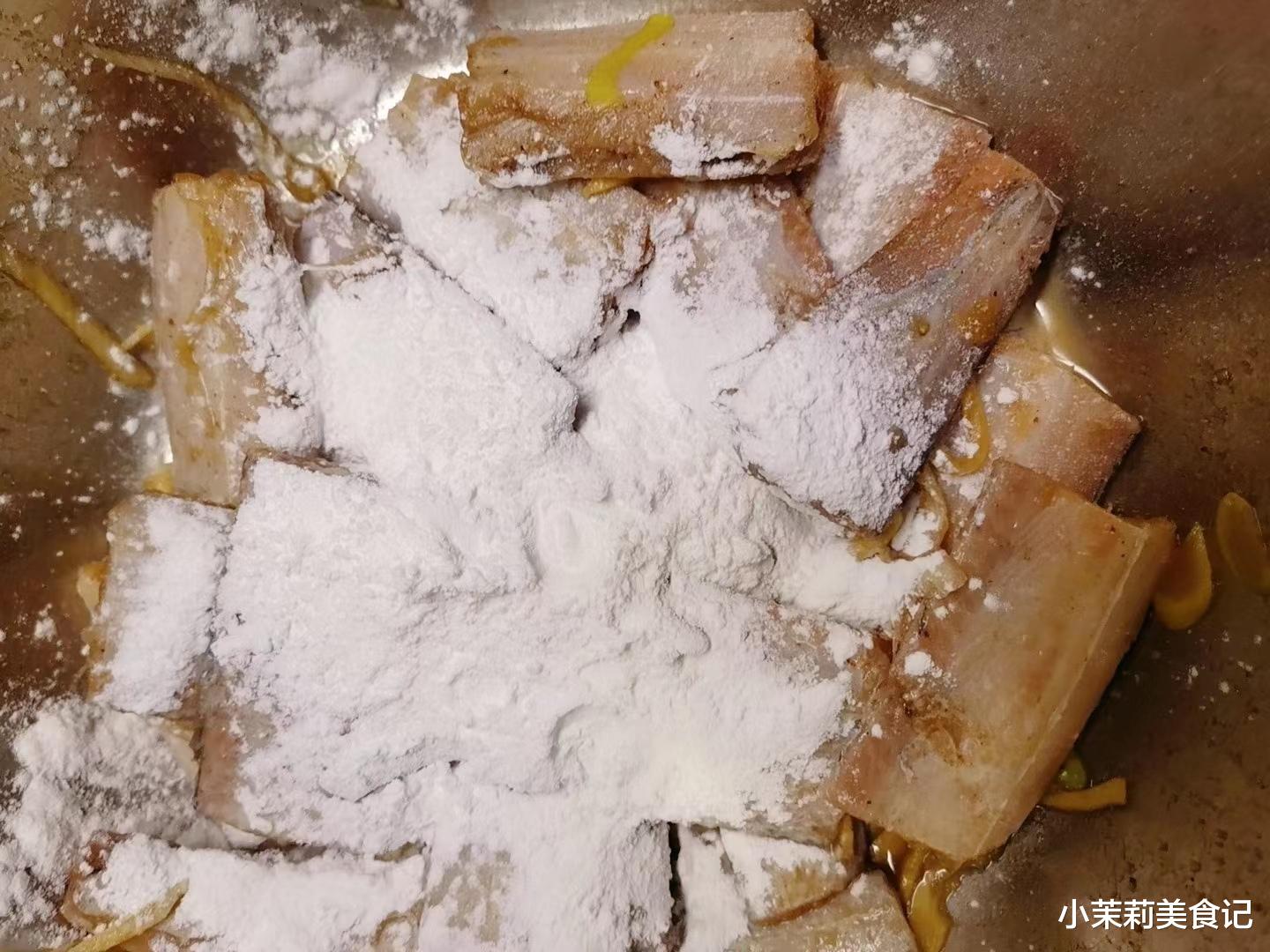 3、接着准备一些淀粉,撒到里边,不用太厚,在每一块的表面薄薄裹一层即可。