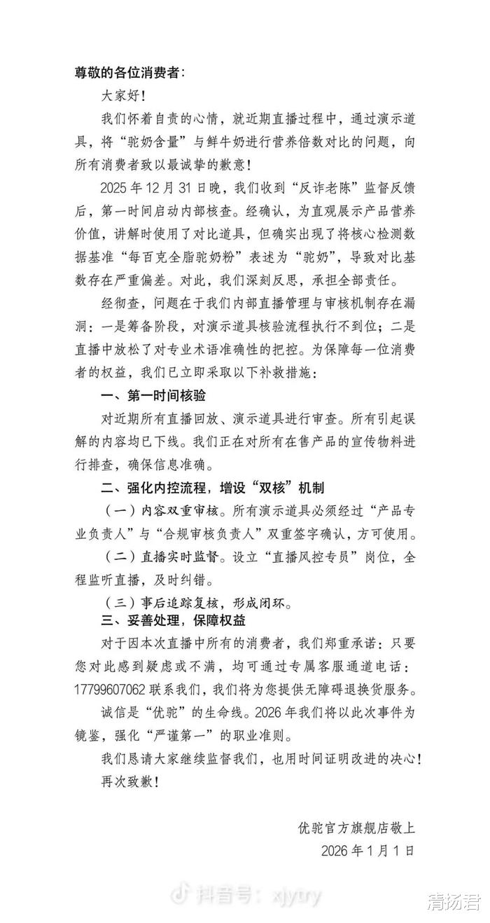 更关键的是,优驼官方自己都承认了问题:直播中拿“每百克全脂驼奶粉”的营养数据,直接跟液态鲜牛奶比,还说是“驼奶”含量高多少倍。这根本不是口误,而是典型的偷换概念。奶粉和鲜奶形态不同、浓度不同,硬要比营养密度,就像拿浓缩橙汁和矿泉水比维生素C含量——结果当然悬殊,但毫无意义。这种对比方式,目的不是科普,而是制造碾压感,诱导冲动消费。说白了,就是用看似科学的演示,干着误导消费者的勾当。