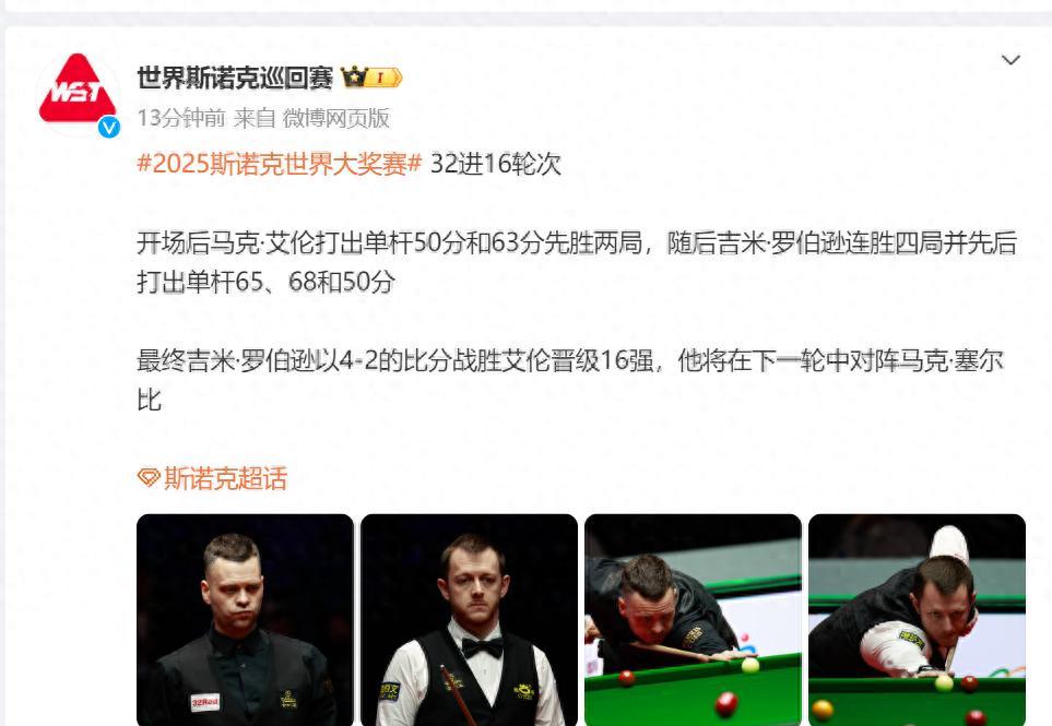 其他的比赛也很精彩,霍金斯对墨菲、吉米罗伯逊对塞尔比,每一场都是强手对决。看来这次的16强真是高手如云啊。不知道最后谁能笑到最后,拿下冠军。反正我是挺期待接下来的比赛的,希望中国选手能多走几轮,最好能有人杀入决赛。不过不管结果如何,能看到这么多精彩的比赛就已经很满足了。