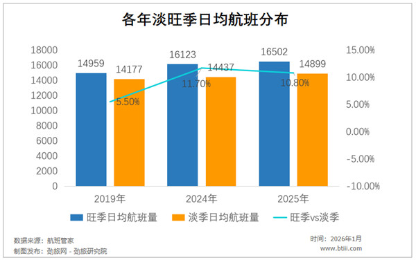 2019年,国内旺季和淡季日均航班量分别为14959班和14177班,差额为5.5%;2024年,我国旺季和淡季日均航班量分别为16123班和14437班,差额迅速扩大到11.7%;尽管2025年这一差额有所缩小,但依然达到10.8%。