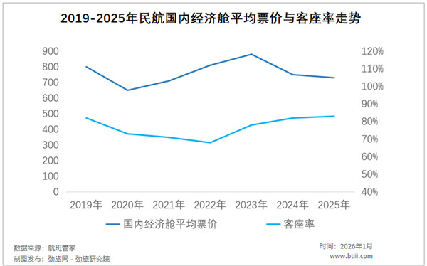 2024年国内航司经济舱平均票价同比下滑12.7%;2025年航司依旧延续低票价策略,全年经济舱平均票价达738元,同比下滑3.1%,简而言之就是所谓的“旺丁不旺财”。