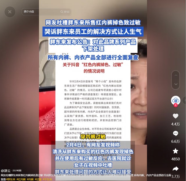在这条视频当中,可不是赞美胖东来的优点,而是博主因其销售的内裤,从而导致了自己身体上出现了多处红斑,严重影响了博主的日常生活。