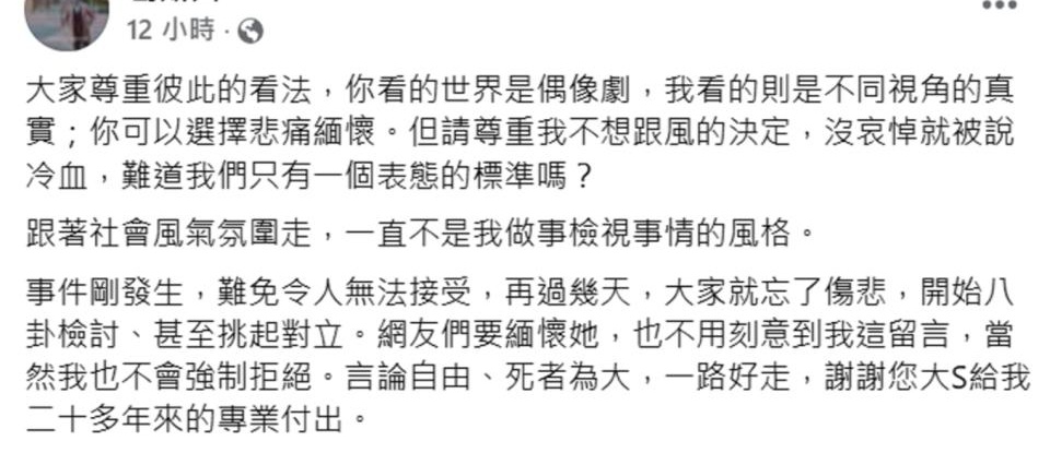 有趣的是,曾与汪小菲和大S有过诸多“恩怨”的狗仔葛思齐,只是因为未发布悼念文章而受到指责。