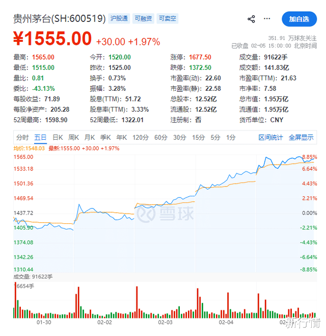 截至2月5日下午,贵州茅台总市值从此前低点的1.79 万亿飙升至1.95万亿,短短四天增长1600亿元,相当于增加了一个中型上市公司的总市值。