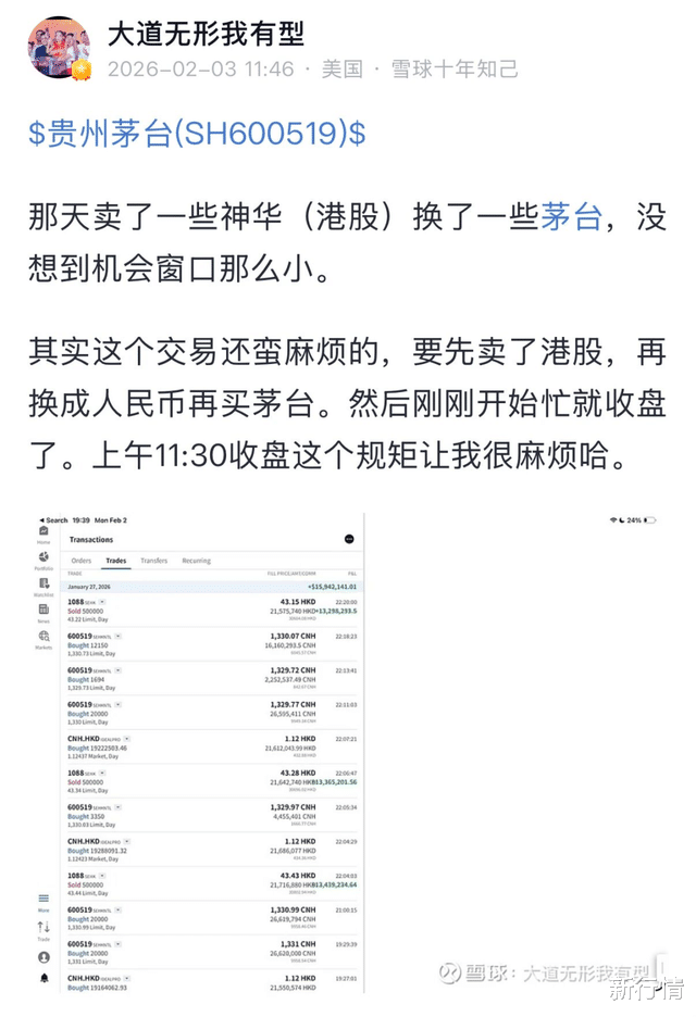 近日,著名投资人段永平在雪球上发文表示,近日卖了一些神华(港股)换了一些茅台。段永平晒出的交易记录显示,1月27日买入贵州茅台约1亿元。