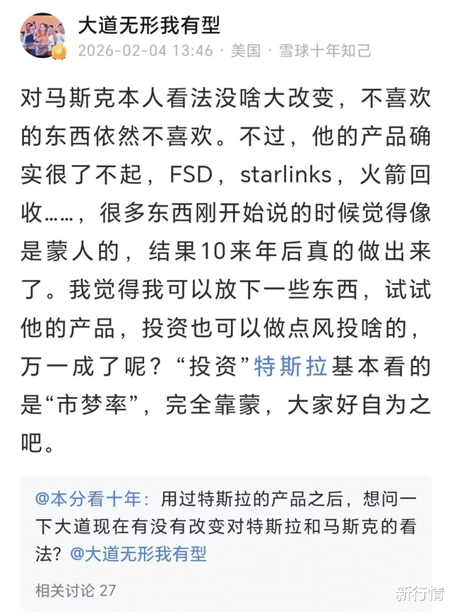 段永平的的看法一如既往:对马斯克的人格保留看法,产品创新表示赞赏。