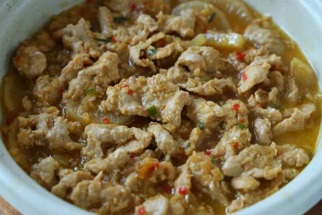 5、由于赶时间,我蒸的时间不够,拿出来白萝卜不太熟,可以把白萝卜切薄一点,熟的更快!蒸的肉会粘连在一起,然后我又放在砂锅里把鸡肉弄散,白萝卜煮至软烂,然后汤汁正好收一收,味道更好了!
