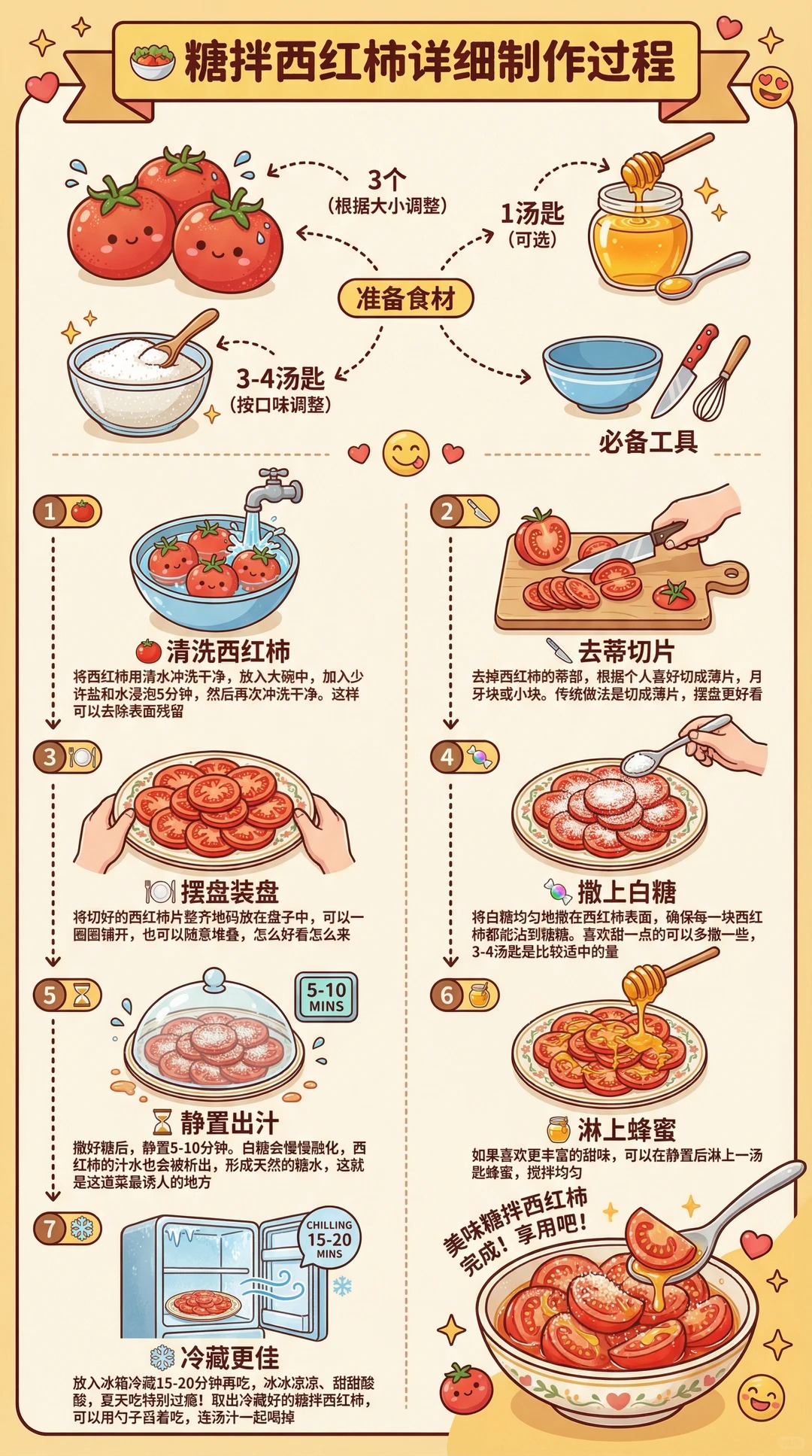 调料:白糖3-4汤匙🍬,根据个人口味和西红柿的酸度调整。可选点缀:蜂蜜1汤匙🍯,增加风味;桂花酱少许,更香甜。