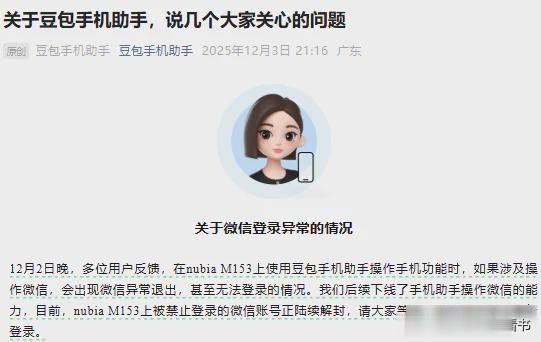 12月2号晚上,有人用中兴nubia M153手机安装了豆包AI助手,想让它帮忙操作微信,结果微信直接把账号踢出来了,提示“异常登录”,第二天晚上,豆包就把微信相关功能关闭了,还帮用户申请解封,很多人一开始以为这是字节跳动和腾讯在打架,其实不是,腾讯方面表示,他们没有主动封禁谁,是系统自己认为这操作很像“群控设备”,自动触发了保护机制。