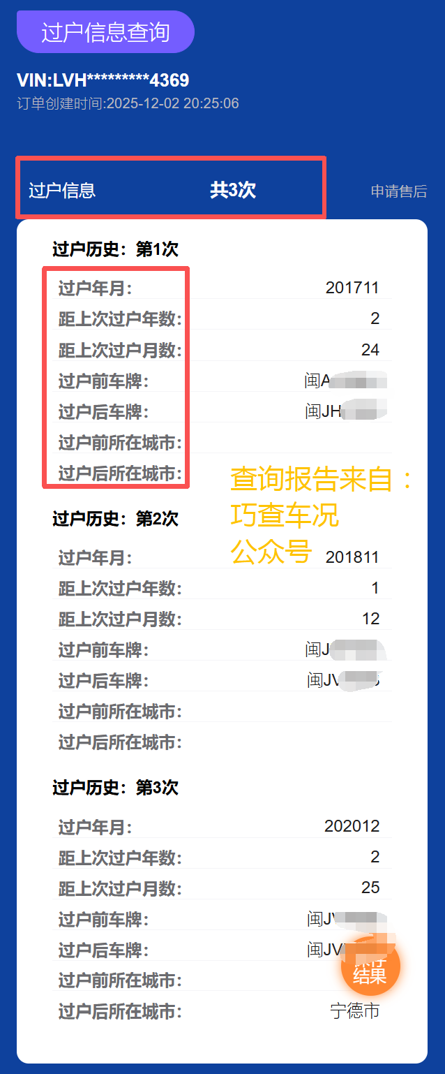 查看核心内容:报告将清晰列明车辆过户次数、上次过户时长、过户前后车牌号及所属城市,助力快速判断产权流转情况。