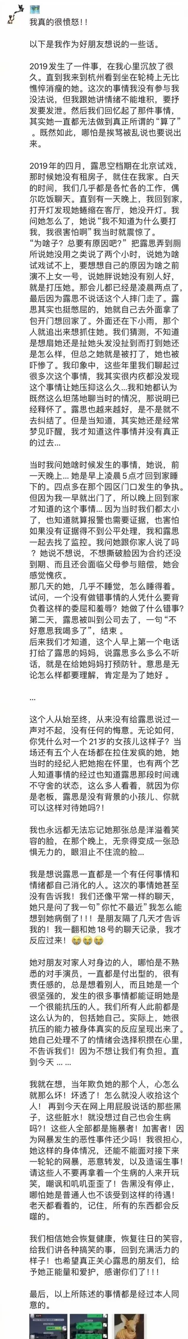 就在解约风波闹得沸沸扬扬之时,赵露思的好友朱锐站了出来,爆料了赵露思在2019年曾遭受的“非人”待遇。据朱锐描述,当时赵露思因试戏女主不成功,被老板酒后发飙,硬生生地被5个人按着在厕所门口训斥了两小时。