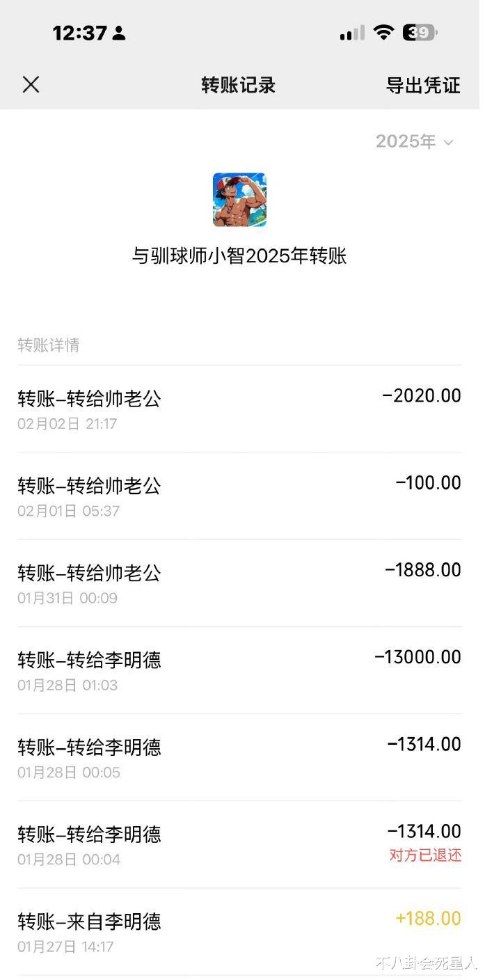 女方将1月底至2月2日的几笔转账截图发了出来,短短几天时间她就向李明德转账近2万元,可男方只有一笔188元的转给女方。