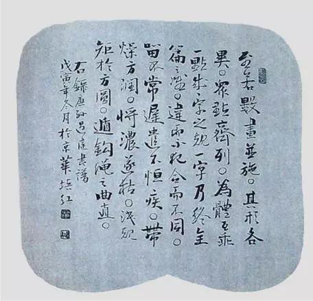 上图也是团扇变形款式,人称芭蕉扇式。章法围着扇边走,行间留白与环圆留白匀称,款和题头在同一个水平线上。