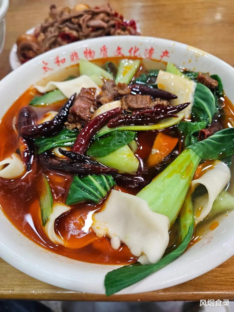 做法讲究“三摔三折”手工摔面,牛油熬辣椒、牛肉丁慢炖出香,浇头一浇,那叫一个“中”!