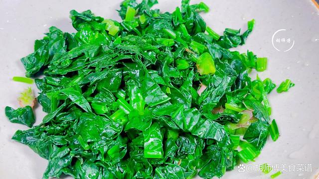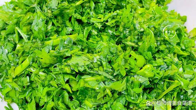 第一步:把茼蒿老叶和茎全部摘的扔掉,然后用自来水将茼蒿冲洗干净后,把茼蒿表面的水沥干,接着再把茼蒿切成如下图所示的小碎末备用。