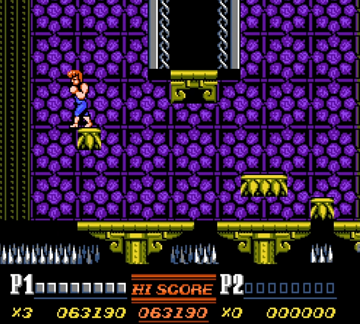 双截龙3代,玩家来到最后一关埃及金字塔,在开始的场景,玩家掉下去就会死命,所以这关我们都是用忍者,因为他的跳跃能力非常的强。