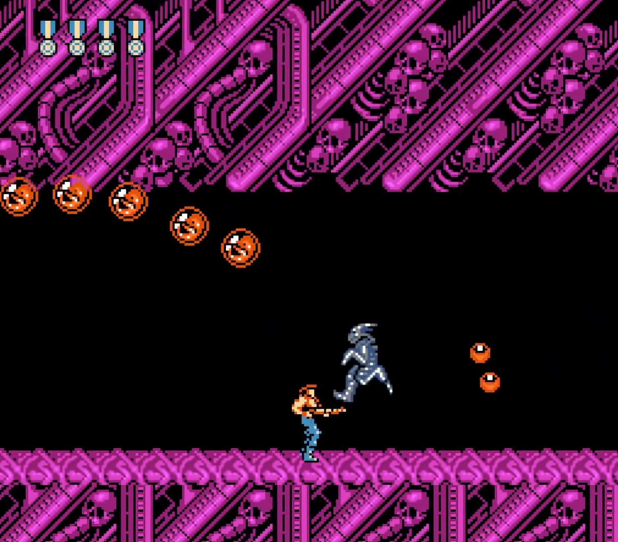 超级魂斗罗最后一关,岩石气泡场景,这个关卡非常的难,岩石砸下来的一刻,玩家很难跳跃,然后石头会出现大量的跟踪气泡,前方还会有悬崖,玩家需要快速前进,躲避气泡攻击,还要小心陆地上速度很快的异形。