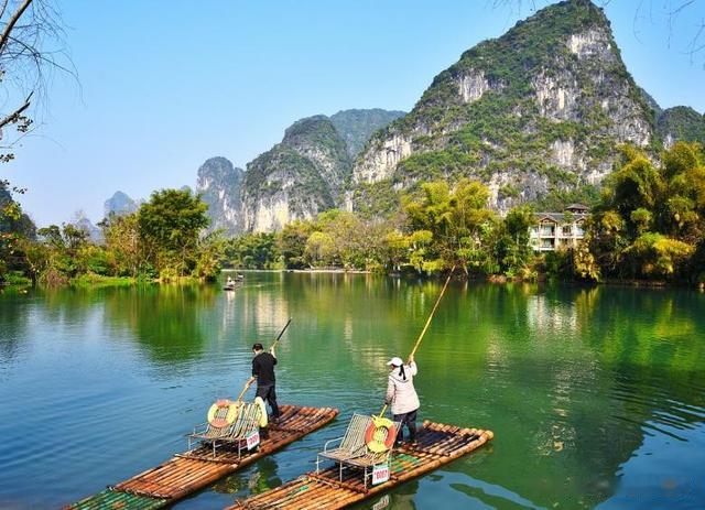 漓江的水清澈见底,山峰则如巨龙般蜿蜒起伏,或像雄鹰展翅,或像古老的城堡。坐上竹筏看白云蓝天,翠山绿水,一切都显得那么宁静、恬淡,仿佛能把所有的烦恼都洗净。
