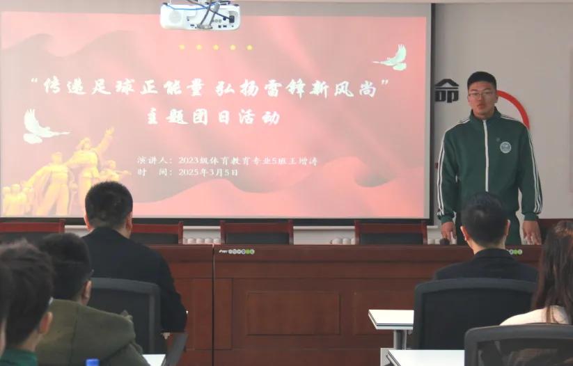 首先,由2023级体育教育专业五班团支书王增涛进行“学雷锋”主题团日宣讲活动。他结合足球运动中的团队协作、奉献精神,讲述雷锋事迹与体育榜样的共通性,呼吁大家要将雷锋精神内化于心、外化于行,用实际行动传递足球正能量,展现新风采。