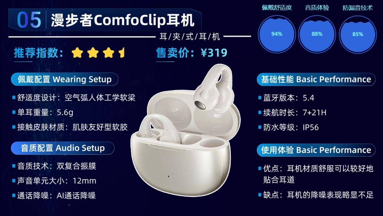 漫步者作为国产老牌音频品牌,产品线涵盖从家用音响到便携耳机,多年来在性价比和调音水平上积累了不少经验。ComfoClip属于它的入门耳夹式系列,主打舒适佩戴和日常娱乐使用,定位偏向通勤、办公或轻运动场景。品牌一直强调“耐听又顺耳”,不追求过分低频轰头或者高频刺耳,而是让日常使用更舒适。