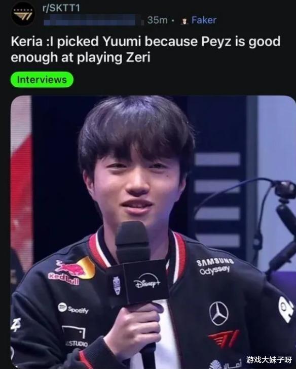 赛后采访中,Keria谈到这一手猫咪选择时表示:“我选猫,是因为Peyz的泽丽玩得够好。”这原本是一句非常中性的评价,既解释了BP思路,也顺带肯定了AD选手的个人能力,然而在韩国论坛和社交平台上,这句话却迅速被“过度解读”,不少网友认为,这番话的潜台词是:过去T1之所以很少拿出泽丽加猫咪,并非体系不强,而是当时的AD并不足以支撑这一套打法。