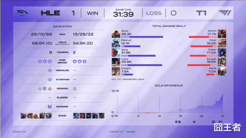 结果比赛的前中期,两队打得比较激烈,经济咬得很紧,但是到了比赛后期,HLE笑到了最后。比赛第17分钟左右,两队在上路爆发激战。Zeka永恩Q3R控到三人帮助HLE打出2换5团灭T1,此后HLE取得3000经济领先;比赛第21分钟左右,两队爆发小龙团。T1抢到小龙但HLE状态劣势下打出3换3;比赛第23分钟左右,两队爆发厄塔汗团。Keria潘森进场被瞬秒,Delight芮尔大两个帮助HLE打出0换3;比赛第25分钟左右,T1中野落单被抓,Zeka永恩单杀Smash飞机后帮助HLE打出1换5团灭T1拿下大龙;最终比赛第31分39秒,HLE打出0换5一波结束比赛。