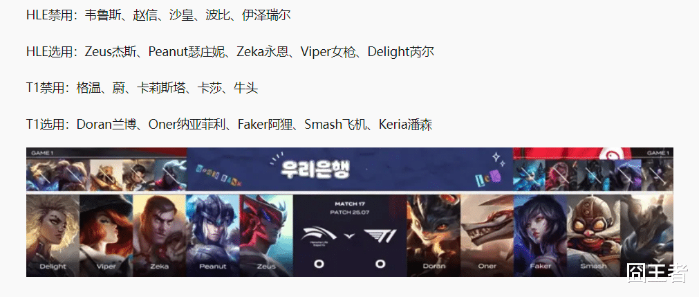 第一局比赛,HLE蓝色方,禁用韦鲁斯、赵信、沙皇、波比、伊泽瑞尔,选用杰斯、瑟庄妮、永恩、女枪、芮尔;T1红色方,禁用格温、蔚、卡莉斯塔、卡莎、牛头,选用兰博、纳亚菲利、阿狸、飞机、潘森
