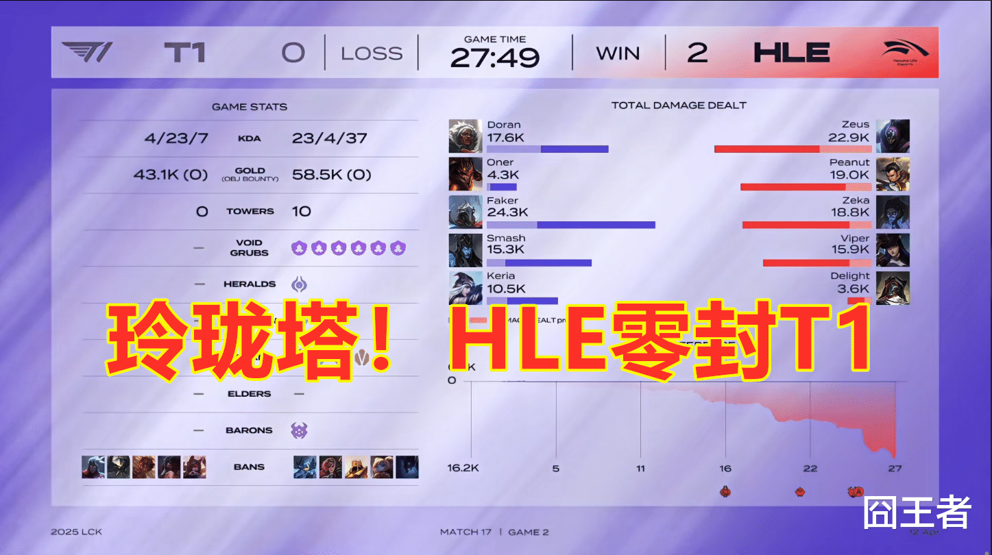 结果第二局比赛,被HLE打成了单方面的碾压局,整局比赛被HLE完全打花了。在第二局比赛中,T1未能拿到包括防御塔、厄塔汗、巢虫、峡谷先锋、厄塔汗、小龙、大龙在内的任何资源。值得一提的是,上一次T1在一线赛事(包括LCK联赛、MSI、S赛、电竞世界杯在内)中被玲珑塔还要追溯到2022年LCK夏季赛决赛T1对阵GEN第二局。