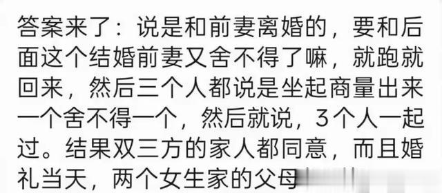 更令人咋舌的是事件背景。原来,两位新娘一位是吴某的前妻,一位是现任。前妻因感情深厚不愿分开,三人经过"友好协商",竟决定打破常规,以"一夫二妻"的形式共同生活。更夸张的是,双方父母居然也默许了这场荒唐的结合,甚至准备共同出席婚宴见证"喜事"。