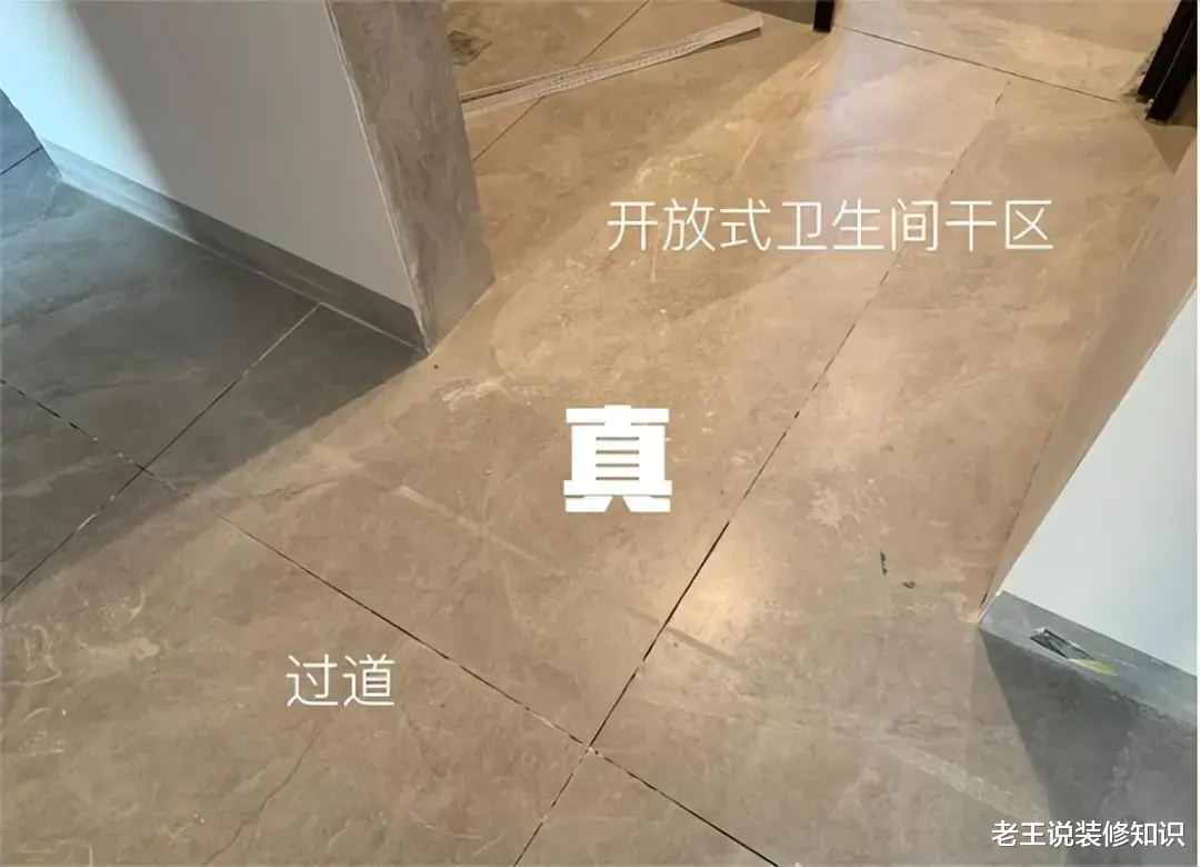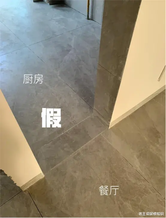 对贴砖师傅来说,厨房区域与餐厅区域分开贴更好操作,而且说起来是为了省瓷砖用料了,只能无奈接受。而真正的通铺是按照提前排好的版,整块铺砖,在过门的地方是没有那些难看的小条砖的。