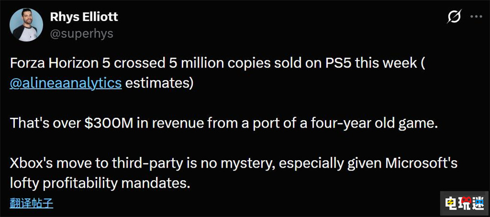 微软在2024年就已经开启了旗下Xbox第一方游戏登陆索尼PS5的多平台发行战略。对于其成果,根据Alinea Analytics分析师里斯·埃利奥特(Rhys Elliott)的消息,《极限竞速:地平线5》PS5版销量已经突破500万份。