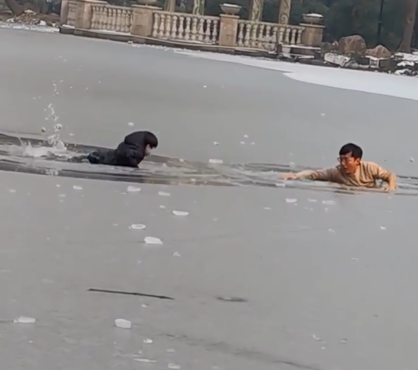 就在这危急时刻,一阵急促的脚步声由远及近,另一位热心市民循着动静赶来。这位市民也深知冰面的危险,他学着班隽楠的样子,小心翼翼地匍匐到薄冰边缘,伸出手,牢牢抓住了班隽楠冻得发紫的手。“使劲!” 伴随着一声大喊,热心市民咬紧牙关往后拉,班隽楠也拼尽最后一丝力气向前探身,终于,在两人的合力之下,班隽楠成功爬上了冰面,脱离了险境。
