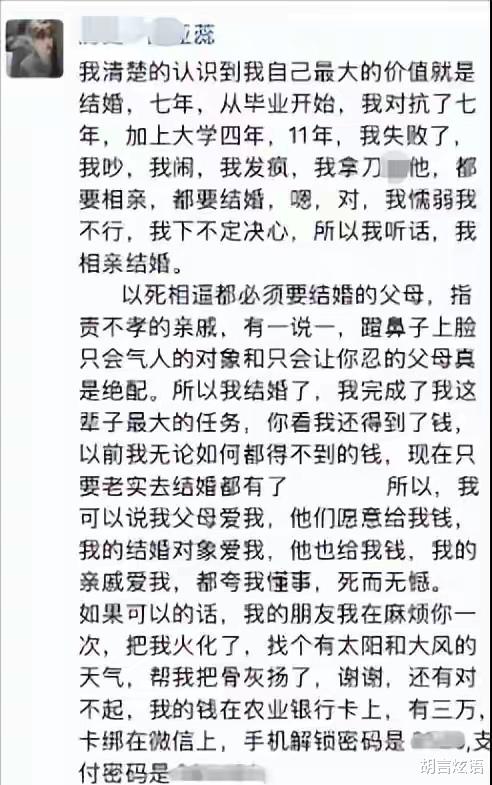 悲剧发生后,不少人惋惜:就算真的是被逼婚,也不该选择轻生这条绝路。是啊,人生有千万种选择,大可以和父母坦诚沟通,甚至暂时断绝关系,去追寻自己想要的生活。毕竟,父母终究是在乎子女的,一时的争执与隔阂,总好过以生命为代价的诀别。可局外人的劝解,终究难以体会当事人内心的煎熬。当一个人被裹挟在亲情与世俗的双重压力中,当所有的反抗都被视为“不懂事”,当看不到任何挣脱的希望时,她的绝望,或许早已积攒到了临界点。