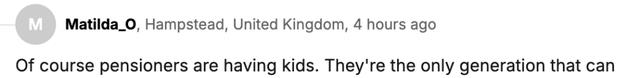 “当然,退休老人也会生孩子。他们是唯一能负担得起的一代人。”