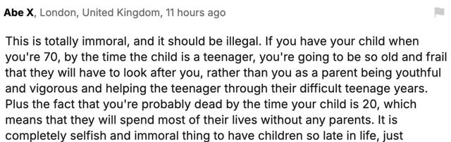 “这简直有悖人伦,应当被法律明令禁止。想想如果你70岁才生孩子,等到孩子步入青春期时,你早就老了。本该由充沛精力的父母陪伴孩子度过叛逆期的时光,反倒要让孩子来照料风烛残年的你。