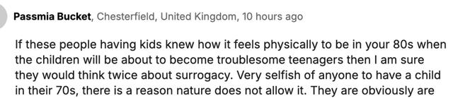 “如果这些通过代孕要孩子的人能体会到,等孩子长到最叛逆的青春期时自己已经八十多岁的身体感受,我相信他们一定会三思而后行。任何人在七十多岁还要孩子都极其自私——大自然不允许这个年龄生育是有原因的。他们显然完全没有为孩子考虑,只顾着自己的一己私欲。”