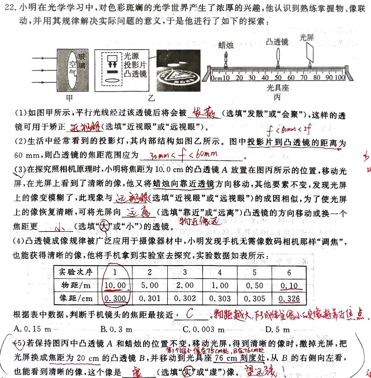 这道题围绕凸透镜成像规律展开,还涉及透镜对光线的作用、视力矫正等知识,把光学核心内容串起来了,特别适合梳理知识体系。