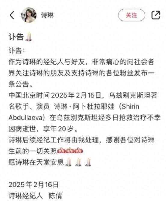 2月16日,年仅20岁的乌兹别克斯坦歌手诗琳因病去世,消息传出后,许多人感到震惊与惋惜。她的离世让人们意识到生命的脆弱,尤其是年轻的生命。诗琳的音乐才华在短暂的生命中绽放,给无数人带来了感动与快乐。她的故事不仅是对她个人的追忆,更是对整个音乐界的深思。