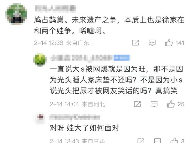 网友们对于这些说法都纷纷发表了自己的意见,有人说这争孩子是假争遗产才是真,鸠占鹊巢本质上也是徐家在和两个小孩争遗产。