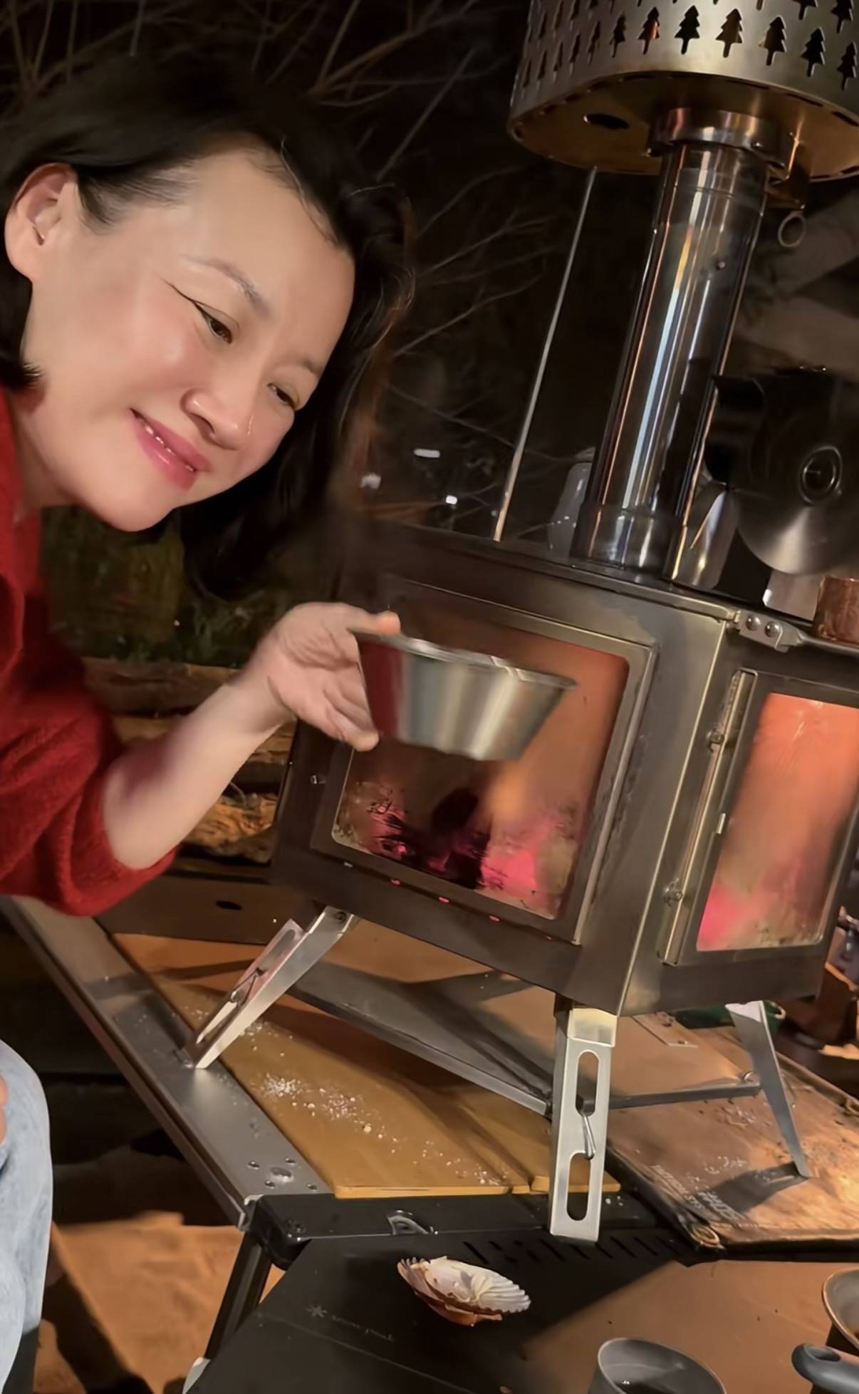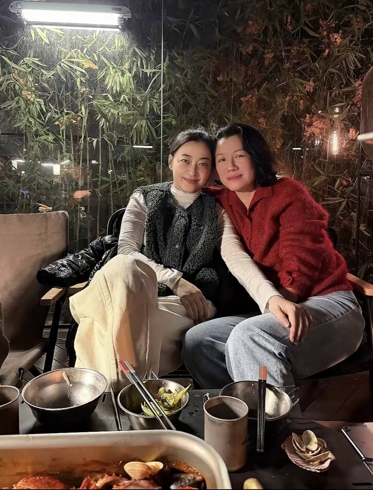 聚餐的时候,刘琳穿了一件车厘子红的红毛、搭配了宽松的牛仔阔腿裤,松弛感慢慢。和梅婷坐在一起,就像是老闺蜜的聚会。