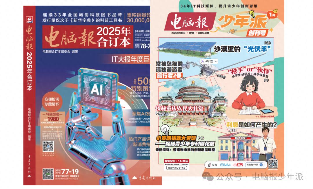 此外,为满足市场需求,《2025电脑报合订本》将在本周加印1000册,在本报官方旗舰店购买合订本的同学,将获得价值10元的《2026年电脑报少年派创刊号》(注意,一定要在本报电商购买,才能一并发出,想节约一个小小的邮费)。