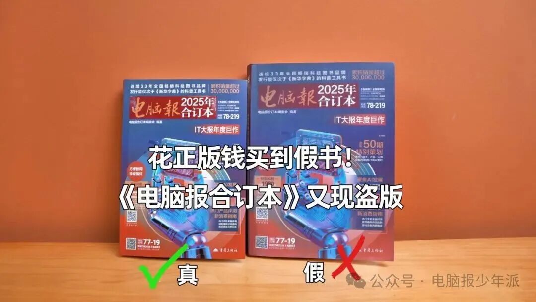 正因如此,合订本被盗版分子盯上,如今在电商上出现质量低劣的盗版书,我们小编在某电商买了一本核实,其品质和做工上看只能叫做“影印版”,和电脑报正品原版书有极大的差异。为保证广大读者和网友的权益,编辑部专门赶制拍摄了一段对比视频,请读者朋友们仔细分辨真假,切勿上当。