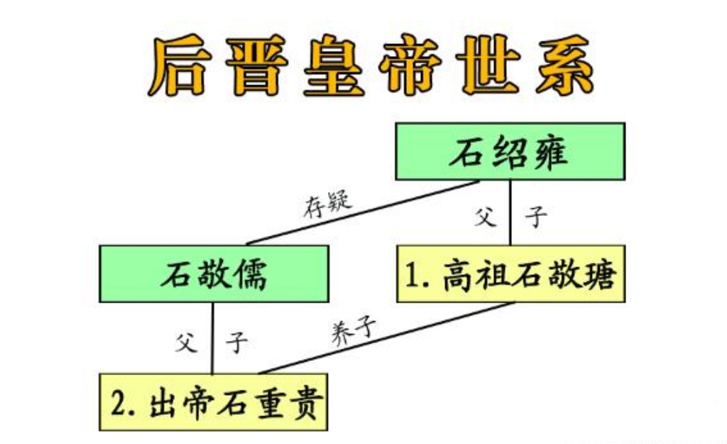 1.后晋高祖石敬瑭:后晋开国皇帝。石敬瑭是沙陀族人,其父石绍雍(胡名臬捩鸡)因善骑射投奔李克用,官至平、洺二州刺史。
