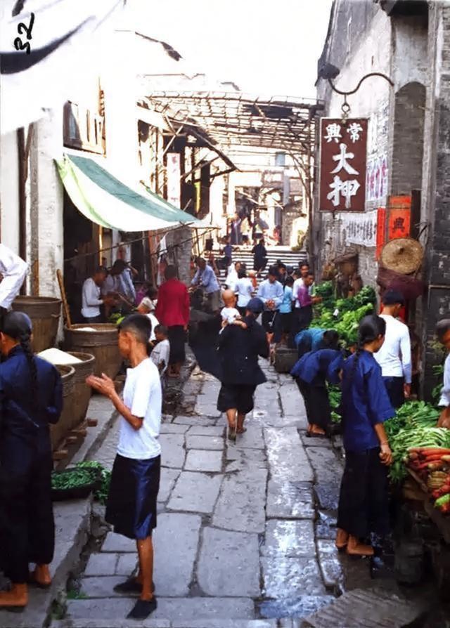 挑担小贩蹲在路边摆开菜摊,鲜蔬堆得冒尖;抱娃的妇人裹着短褂挤过人群,布裙扫过石板缝里的青苔;穿白衫的少年站在铺前闲聊,旁边大木桶里浸着待售的干货。两侧店铺支起旧布遮阳篷,篷布晃着漏下细碎光影,这里没有地标建筑的庄重,只有老城最鲜活的日常脉搏。