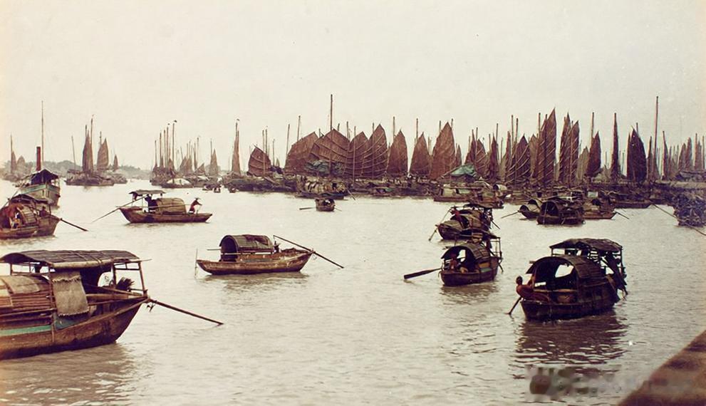 这是1880-1890年间晚清广州珠江的港面盛景,浑浊的江水被密密麻麻的船只铺满,活前方窄小的竹篷船轻浮在水面,深色船身裹着旧旧的竹编顶篷,后面连片的大帆船更衬出港口的繁忙,成排的桅杆刺向灰蒙的天际,船身挨船身挤得密密匝匝,该是往来广佛、粤港的商贸货船,载着丝茶、杂货穿梭于航道间。
