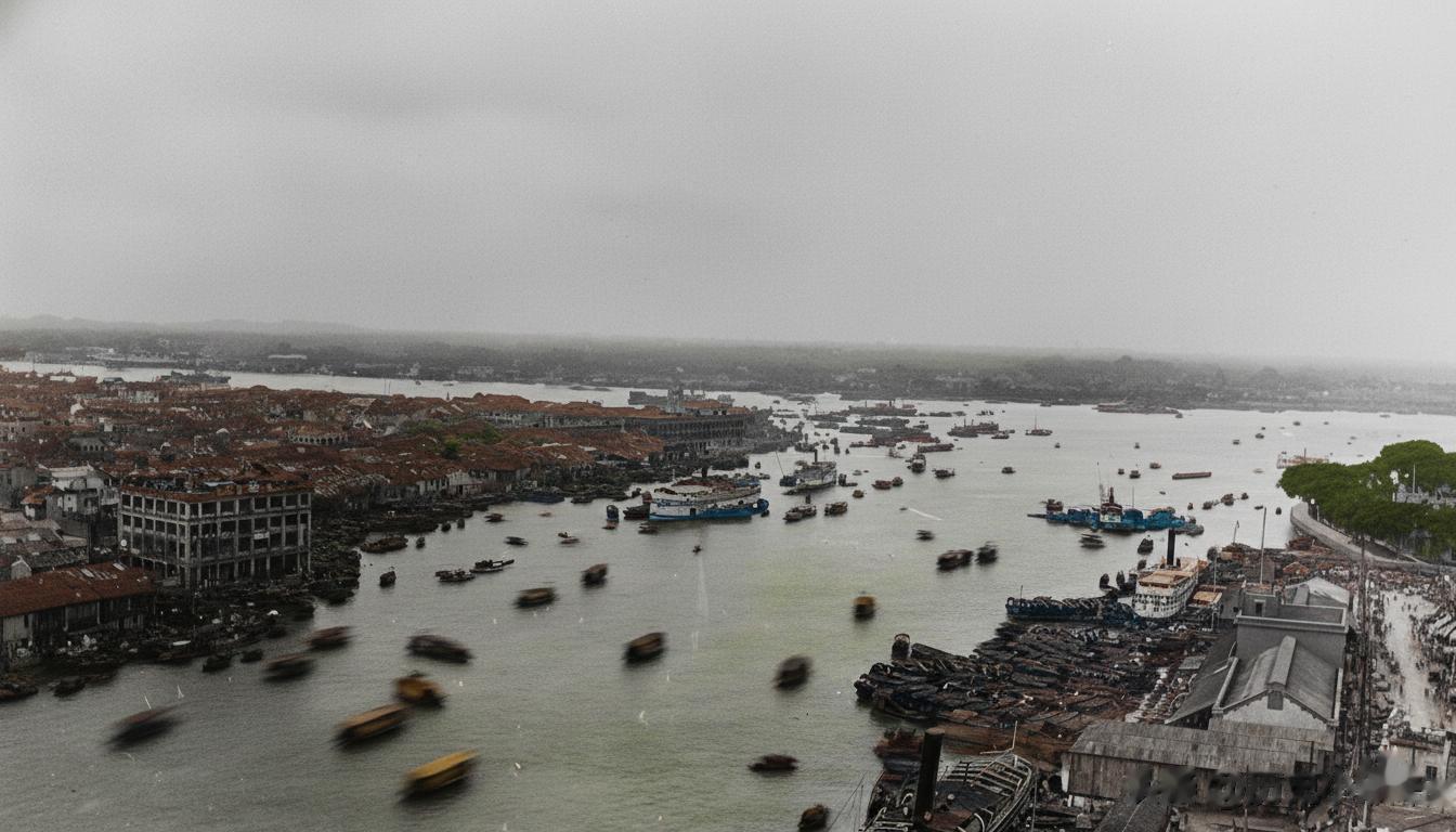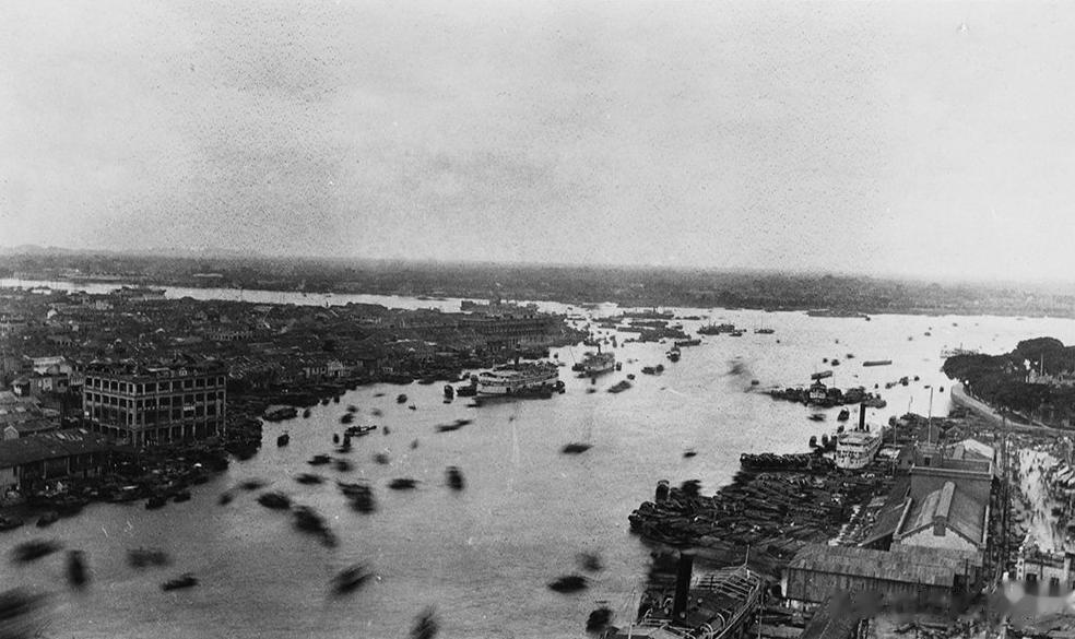 这是1923年俯瞰视角下的广州珠江,灰蒙天色里,江面像铺了层晃动的“船毯”,把民国初年广州新旧交织的港埠风貌裹得真切。