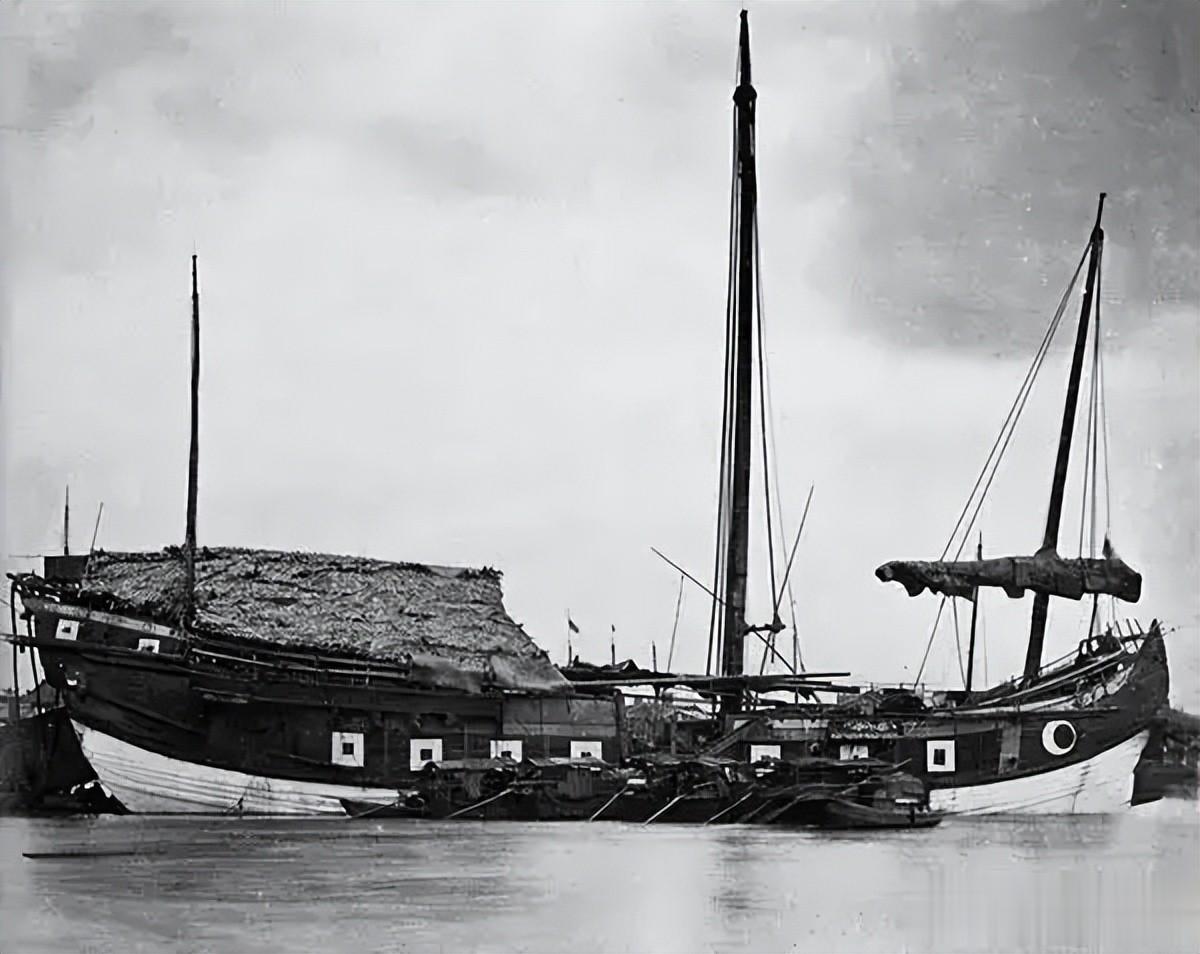 这是1870年代泊在珠江水面的广式三桅帆船,是当时南中国航道上的“商贸主力舰”——主桅高高刺向灰蒙江天,旁侧两桅撑着疏朗的帆索,船身深浅色块相间,舱室顶铺着厚实的草席,像给船裹了层粗朴的“移动屋顶”,船身整排小方窗透着广式造船的实用巧思。