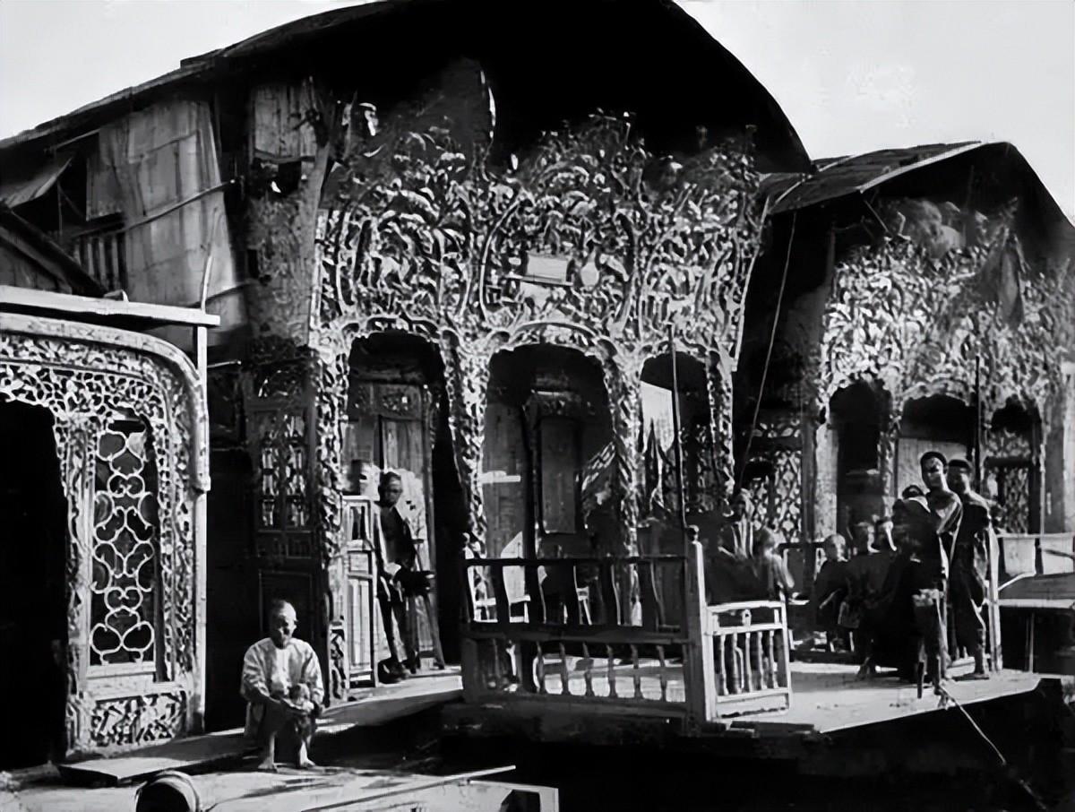 这是1871年珠江上的广州花船,船身被细密繁复的雕花铺满,门窗、廊柱都刻着精巧纹样,像把陆上的装饰性建筑搬上了江面,花哨的雕饰让它在朴素的货运、生计船群里格外扎眼。