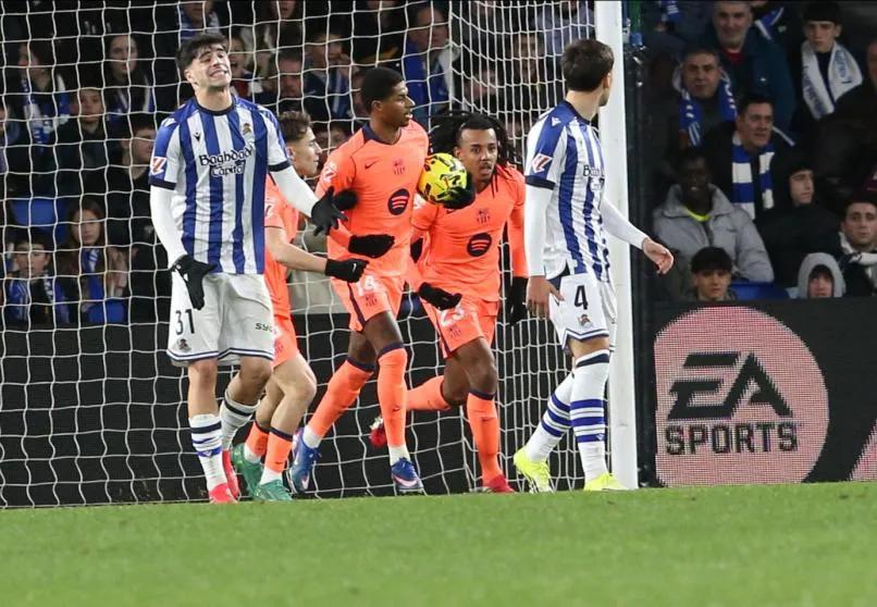 整场比赛的剧本,从开场就被争议判罚拉满。第1分钟,奥亚萨瓦尔率先打破僵局,可VAR回放精准捕捉到其越位在先,进球遗憾被吹,皇家社会的梦幻开局化为泡影。反观巴萨,随后的进攻同样屡屡碰壁,第9分钟奥尔莫抢断久保健英后助攻费尔明远射得手,却因抢断时的犯规动作,再度被裁判取消进球,两队开场便陷入“进球无效循环”。