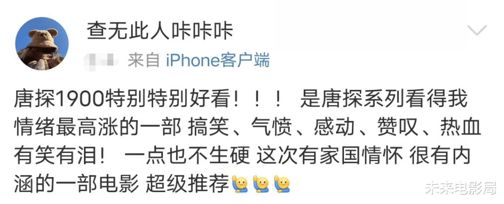而这场戏的质感其实也是整部电影的缩影,《唐探1900》真的是一部良心之作,笑点很多很密也很新,又在立意上有所拔高,能回味很久。